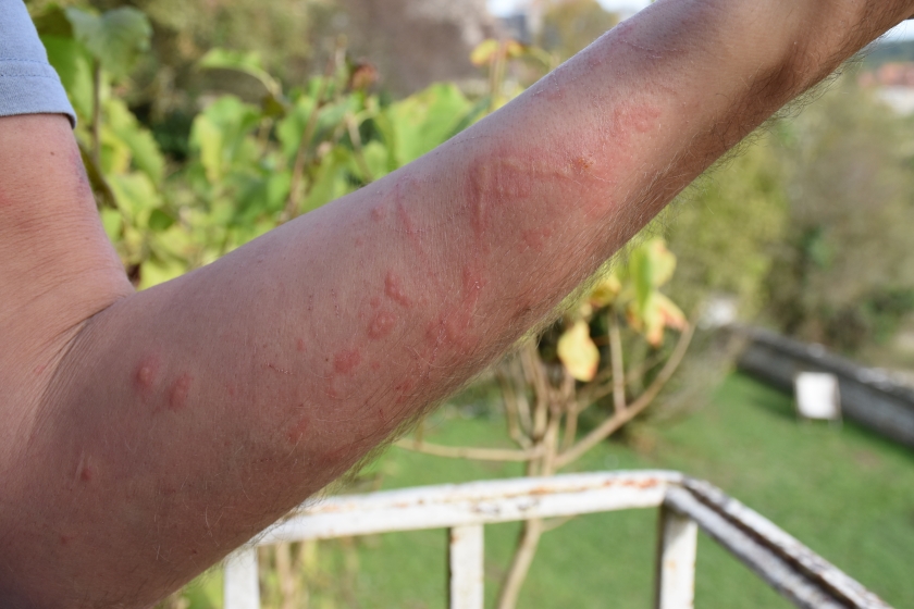 L'arrachage de l'herbe à puce dans le jardin poitevin a déclenché une réaction brutale et rapide alors même que T. était prévenu du danger. Il portait des gants mais avait les bras nus à cause de la grande chaleur de ce matin de novembre 2022. Il a arraché les parties aériennes et souterraines de la plante, n'a pas touché les lianes, a pris une douche et s'est savonné. Dans la nuit, il a ressenti des démangeaisons. Le lendemain matin, soit 24 heures plus tard, ses bras à partir des poignets jusqu'aux manches de son t-shirt étaient couverts de boutons isolés ou en plaques. Les démangeaisons étaient très fortes. Quelques jours plus tard, il a dû consulter un médecin : les boutons cloquaient et étaient devenus purulents.